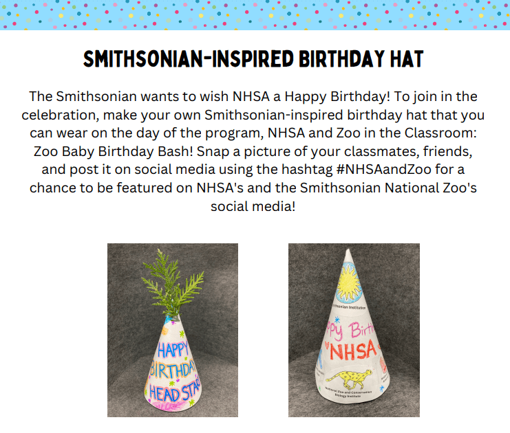 You can see all of our virtual field trips to zoo in preparation for the birthday party by visiting our NHSA in the Classroom page. We can’t wait to celebrate with the zoo!