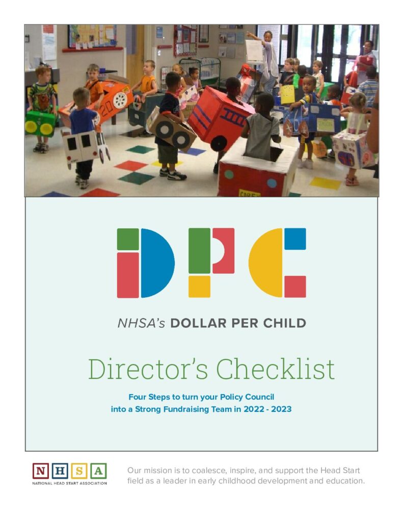 Thank you for your commitment to run a Dollar per Child fundraiser and support NHSA’s advocacy efforts on behalf of Head Start. As a director, you have the crucial responsibility of sharing Dollar per Child with your Policy Council. This checklist will help you empower your policy council members so they are ready to fundraise-and even have some fun along the way!