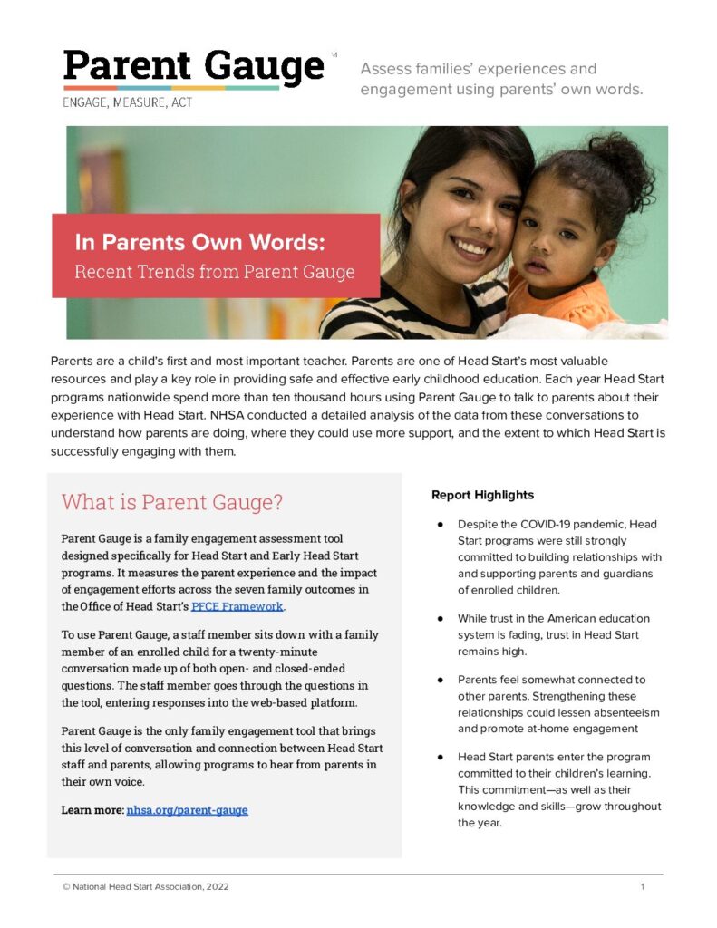 Parents are a child’s first and most important teacher. Parents are one of Head Start’s most valuable resources and play a key role in providing safe and effective early childhood education. Each year Head Start programs nationwide spend more than ten thousand hours using Parent Gauge to talk to parents about their experience with Head Start. NHSA conducted a detailed analysis of the family engagement data from these conversations to understand how parents are doing, where they could use more support, and the extent to which Head Start is successfully engaging with them.