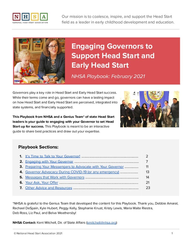 It wasn’t just a stroke of good luck when Governor Kate Brown of Oregon recently approved a state budget that includes million for Early Head Start. It was the result of years of high-quality service delivery from Oregon Head Start and Early Head Start programs, awareness building, advocacy, and partnership work by the Oregon Head Start Association. Although Head Start and Early Head Start are largely fueled by federal funding and regulations, governors are key to supporting program success or impeding progress. On a bipartisan basis, they have a growing interest in supporting early childhood education. In fact, in their 2021 State of the State Address, 18 governors focused on the importance of investing in the early years and supporting families with young children. On the other hand, left uncultivated, their influence in Washington D.C. can open the door to systemic threats to Head Start and Early Head Start’s future, including shifting the program’s tried-and-true federal-to-local grant model to a less effective block-grant that would dilute the program’s connection to local communities, ability to adapt to what families need, and a strong focus on equity. The good news? Over decades, the Head Start community has developed proven pathways to build support among governors and their staff, expand state partnerships and funding for Head Start and Early Head Start, and improve program quality and access. A team of state and local leaders joined NHSA to distill the experience of working with governors’ offices into a new NHSA Playbook: Engaging Governors to Support Head Start and Early Head Start. The Playbook focuses on three keys to success in working with governors: